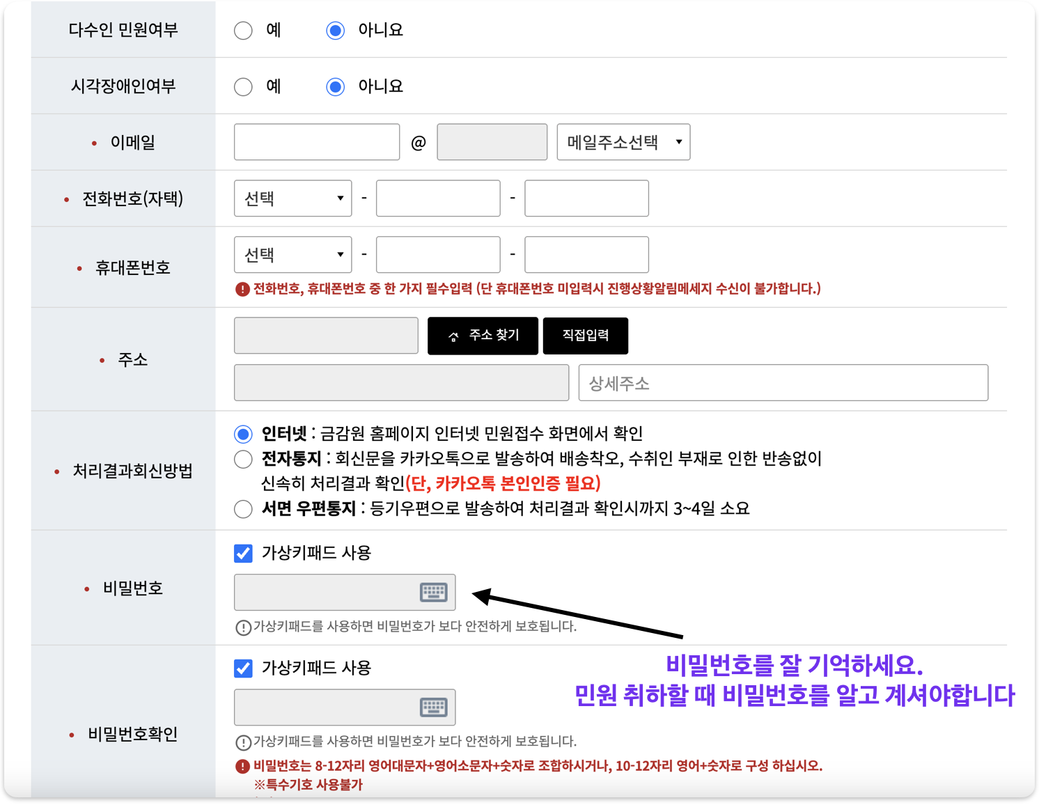 - 민원 작성 로그인 비밀번호 꼭 저장! (스크린샷 등 메모)