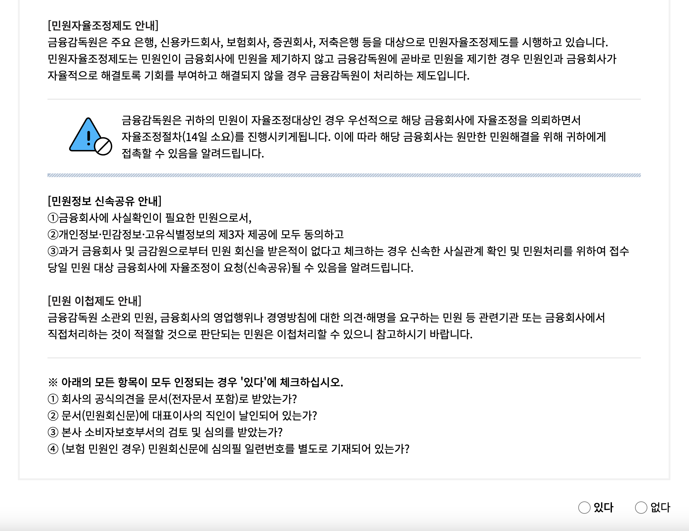 민원신청하기 - 2. 민원자율조정제도 안내 - [해당사항 확인 후 : 있다, 없다 체크] (보통 '없다' 로 체크하시면 됩니다)